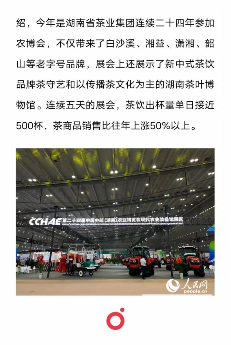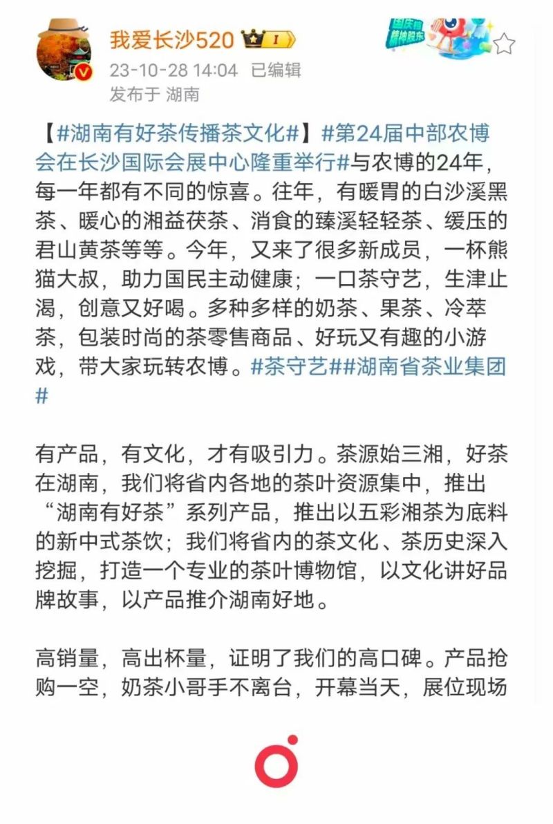 此次農博會,集團一是繼續借助人民網、湖南日報、紅網、長沙晚報、湖南衛視、湖南都市、長沙電視臺等傳統媒體,以高質量高吸睛度的圖文報道和當下流行的短視頻報道增強品牌、產品、渠道宣傳力度。二是繼續利用自身官方網站、微信公眾號、視頻號、小紅書等新媒體同步轉發媒體報道和原創相關內容,借助媒體高影響力和高關注度提高公司自有媒體平臺的粉絲和流量。三是加強與 我愛長沙、 嘉俊日記簿、 三湘頭條等網絡大咖的聯動,通過微博、百度、今日頭條同步宣傳推介集團品牌產品,集團參加此次農博會情況登上長沙同城熱搜,“湖南有好茶傳播茶文化”話題討論熱度持續上漲。四是借力來展位打卡的網紅和名人如湖南衛視著名新聞主播魏哲浩、湖南衛視知名主持人杜海濤等,進一步吸引消費者、擴大茶產品銷售、提升品牌影響力,實現了人氣、銷量、口碑三豐收。掃一掃咨詢微信客服