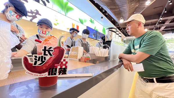 下午時分,眾多游客聚集在位于解放西路西端的茶守藝飲品店門前。門店一側“解放西”文化墻成了游客們的打卡點。“整堵墻的設計就體現了長沙的年輕、活躍和獨有的幽默。‘養生朋克,先喝為敬’這樣的字樣,拉近了茶與我們年輕人的距離。”來自江西南昌的游客鄭彤說。