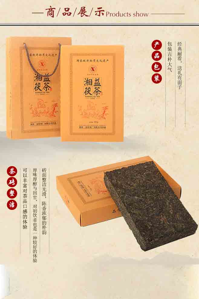 益陽茶廠是全國茯磚茶生產廠家和茯磚茶原料儲備承儲企業,創建于1953年,“湘益”素有“古絲綢之路上的神秘之茶”、“西北少數民族的生命之茶”的美譽,其“茯磚茶手筑工藝”已被列入國家級非物質文化遺產保護名錄。 ??“湘益”茯茶均采用優質黑毛茶為原料,經篩分投入拼配篩制—汽蒸渥堆—壓制定型—發花—干燥出烘—包裝入庫等工序精制而成,茶葉金花普茂,湯色紅濃,滋味醇厚,具有明顯的調節新陳代謝、降脂降糖功效。